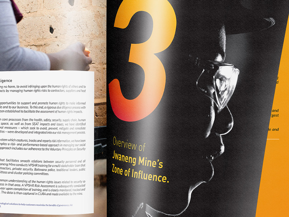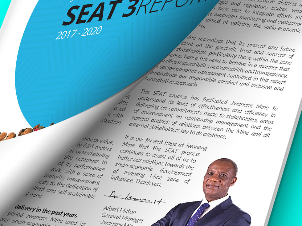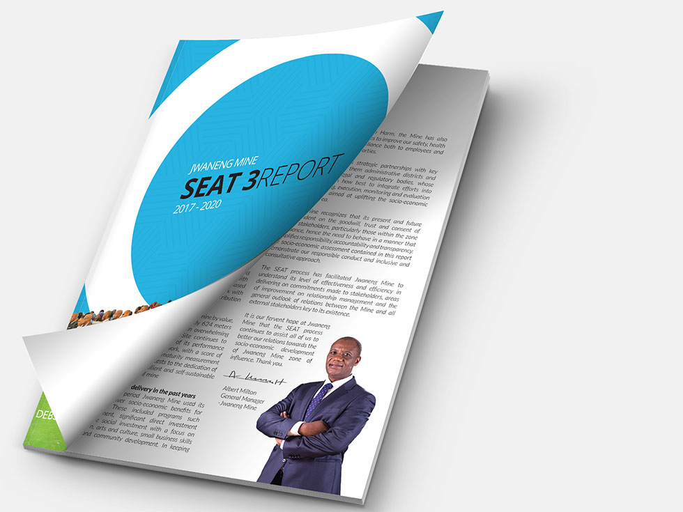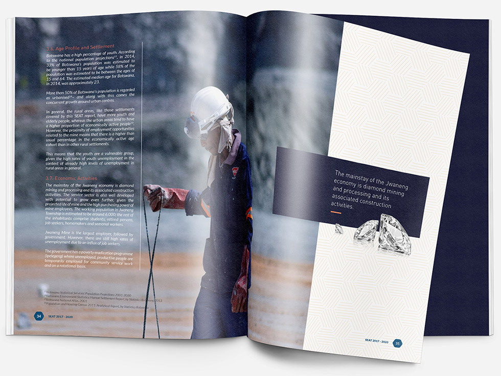 The Socio-Economic Assessment study (SEAT) Report for Jwaneng Mine. The task entailed the design and layout for the editorial and photography of the mine activities, it’s workforce and CRS activities in communities within the mine’s Zone of Influence.